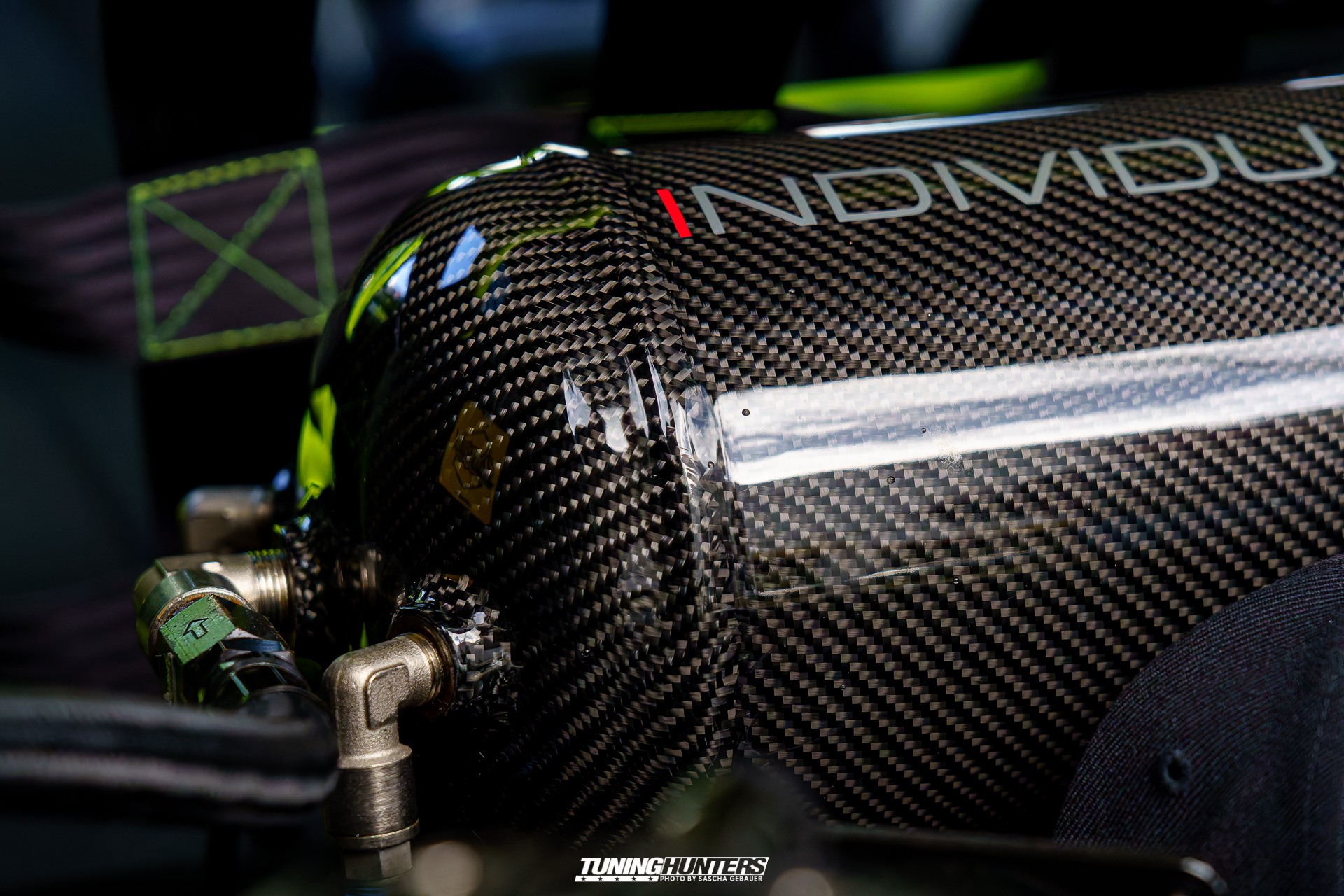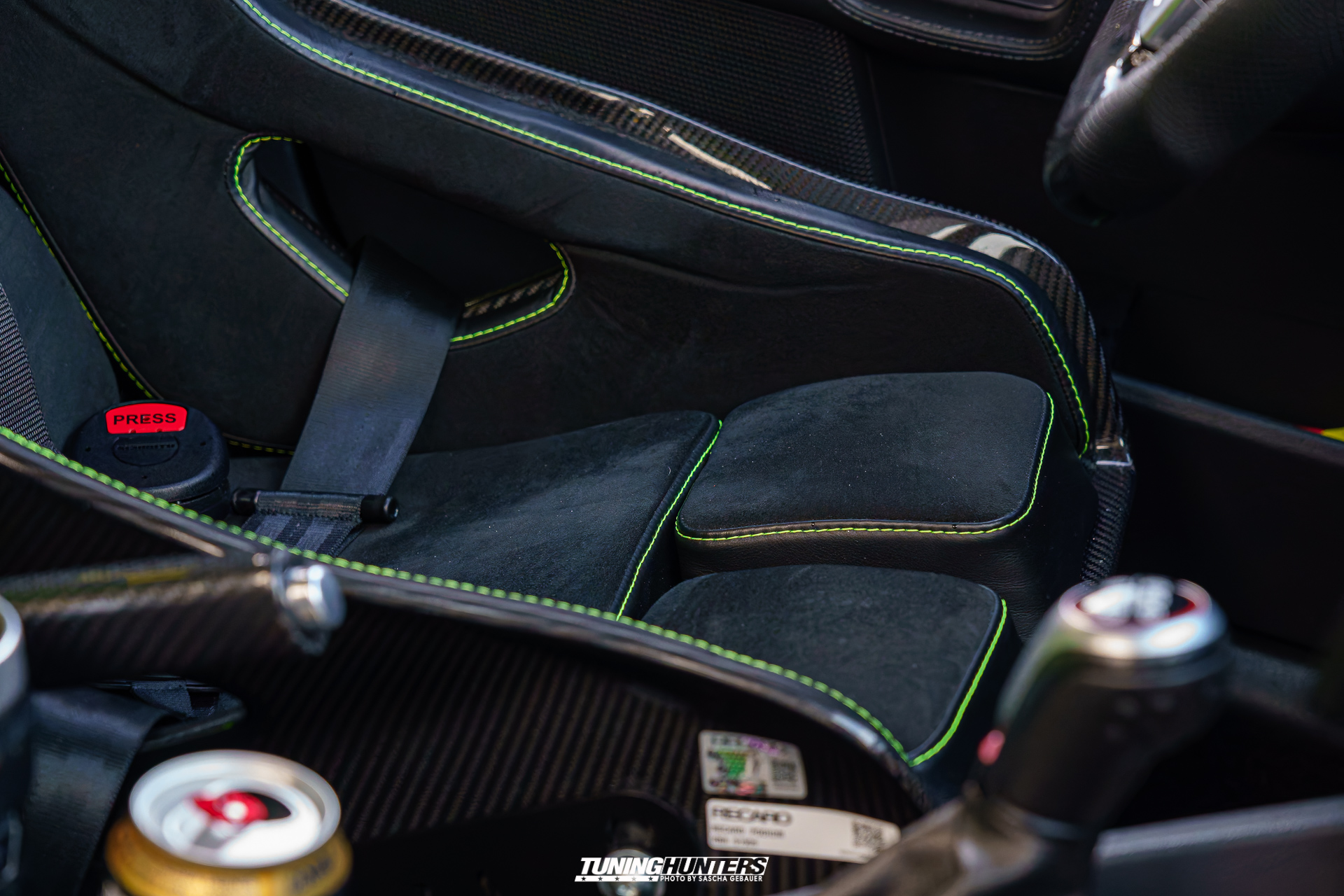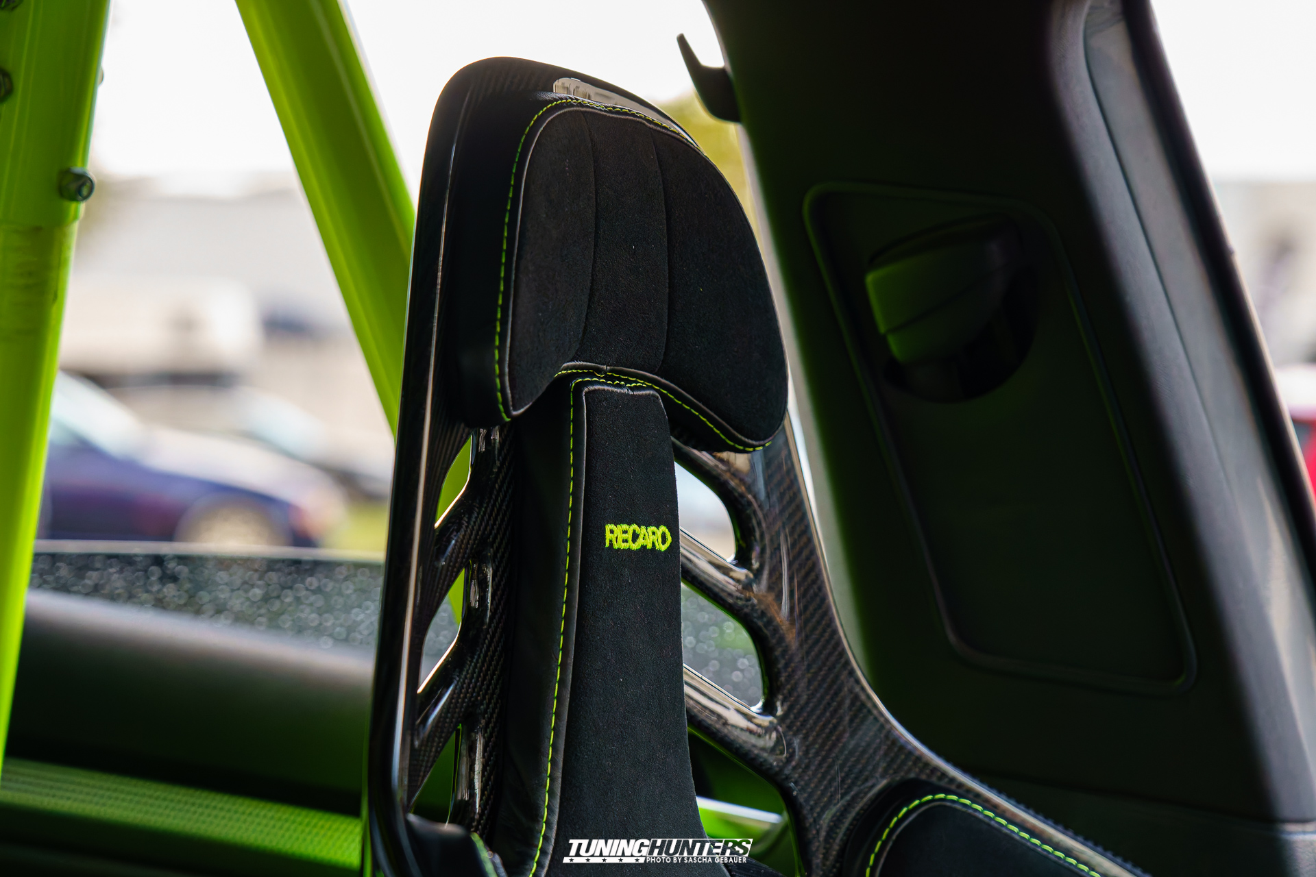 2023 bekam der Wagen schließlich eine neue Haut: United Grey – komplett neu lackiert, um die Spuren vieler Vorbesitzer zu beseitigen. 2024 folgte eine professionelle Aufbereitung samt Graphen-Versiegelung durch SF-Carcare. Die Recaro Podium mit Alcantara/Leder und Neon-Nähten waren das i-Tüpfelchen. Ebenso wie die Porsche-Bremsanlage mit 6-Kolben-Sätteln, grellgrün gepulvert – ein Kontrast, der sofort ins Auge sticht.